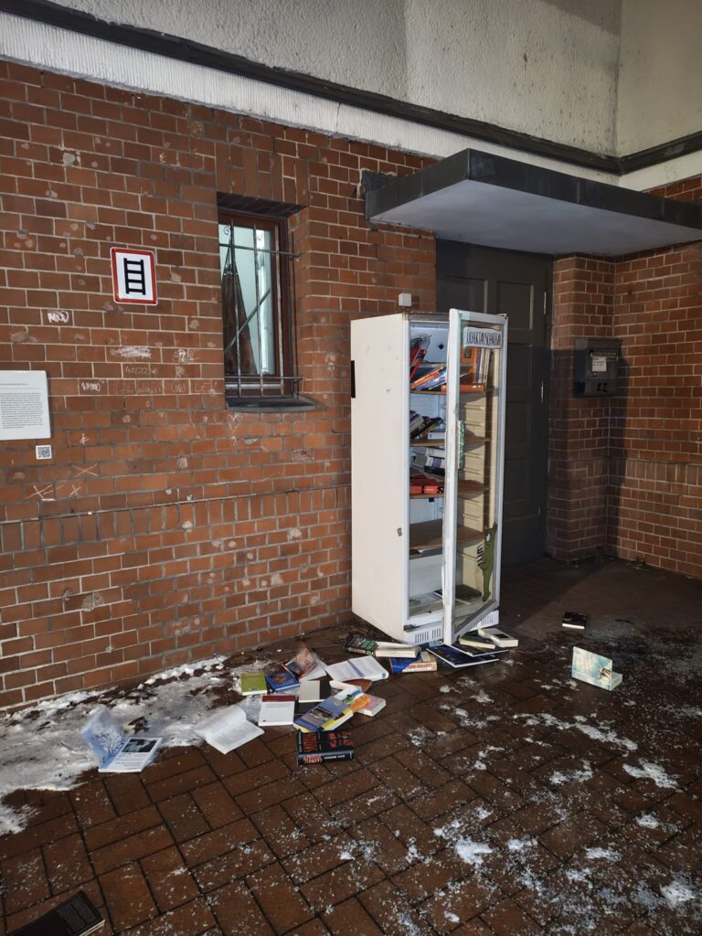 Beide richteten sich gegen das Nachbarschafts-Büchertauschregal, das sich vor dem Haupteingang des Gebäudes befindet.