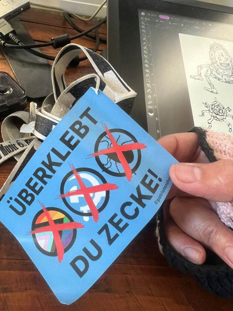 At the same location, far-right stickers were found targeting LGBTQ+ communities, leftist and antifascist spaces, migrants, and cultural initiatives. Nationalist symbols associated with right-wing propaganda were also present. These markings were placed directly at the site of the burned books.