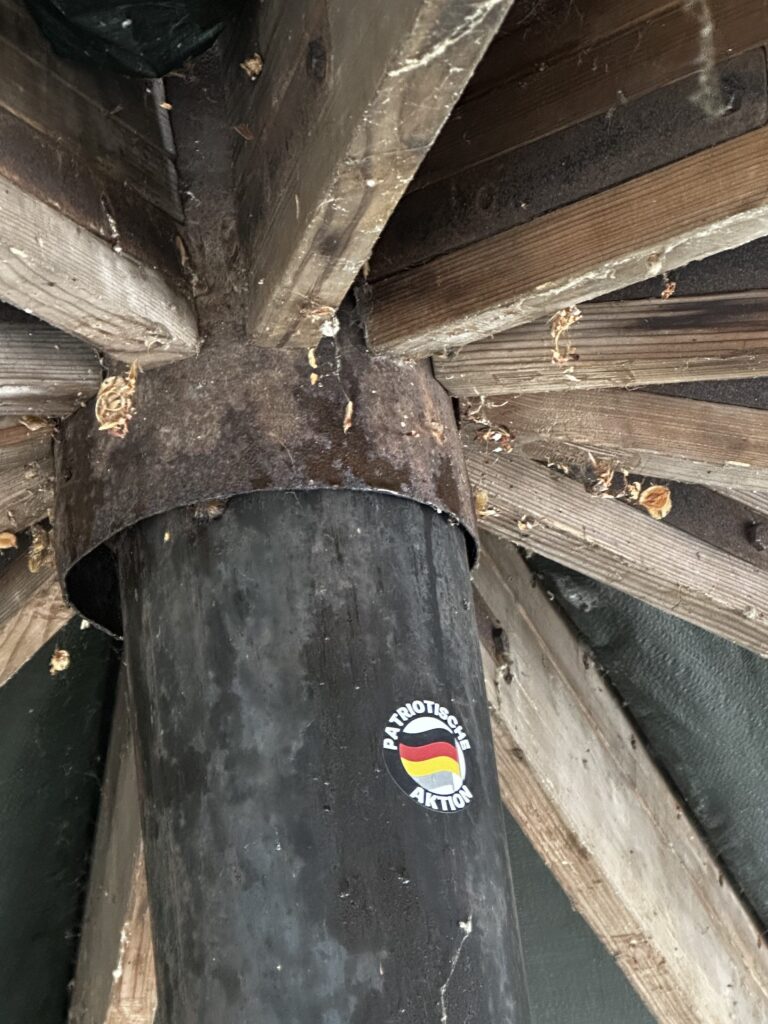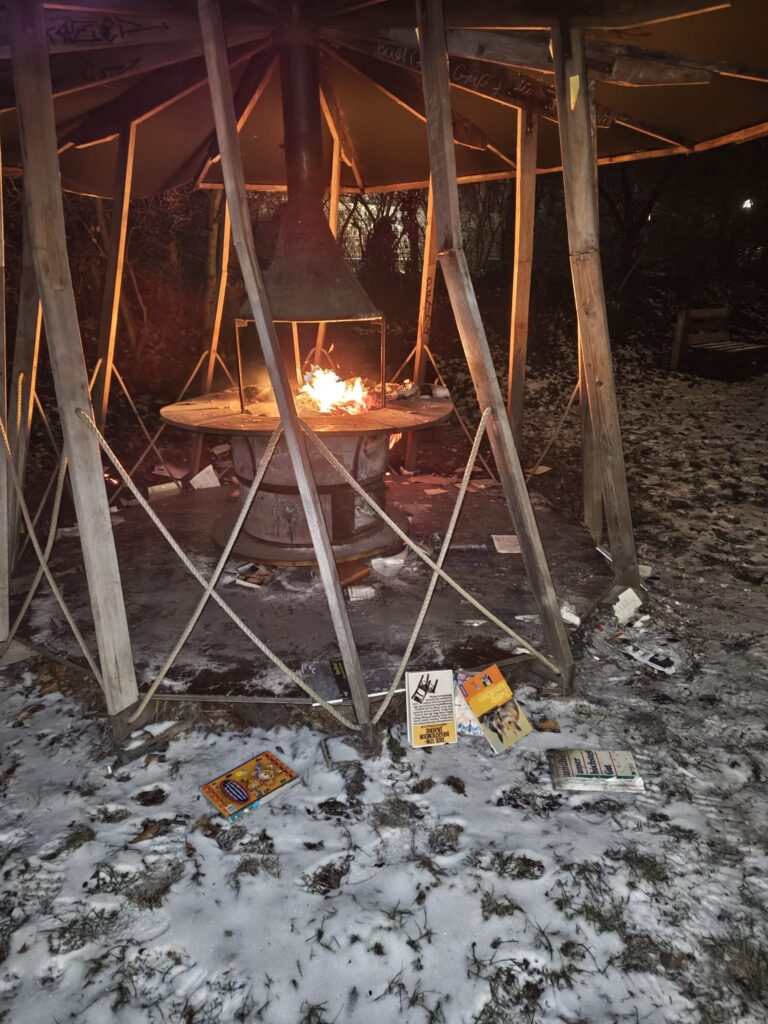 Am selben Ort wurden rechtsextreme Aufkleber gefunden, die sich gegen LGBTQ+-Communities, linke und antifaschistische Räume, Migrant*innen sowie kulturelle Initiativen richteten. Zudem waren nationalistische Symbole zu sehen, die mit rechter Propaganda assoziiert sind. Diese Markierungen wurden direkt am Ort der verbrannten Bücher angebracht.